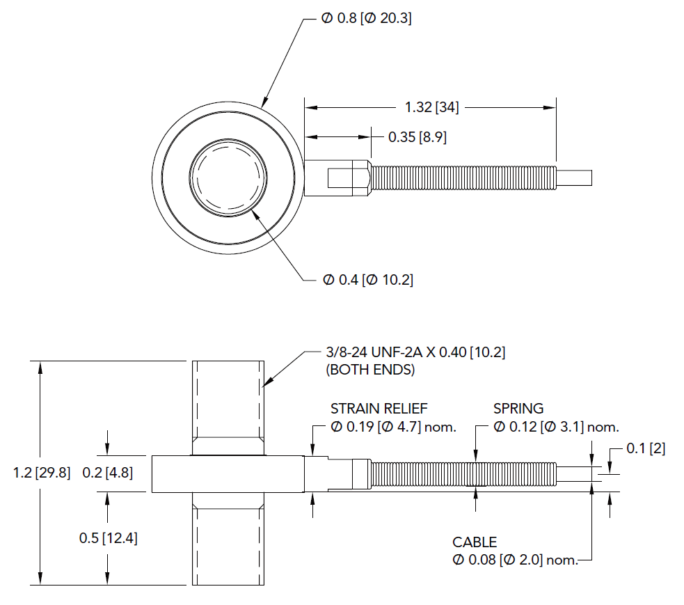 LCM200微型軸向拉壓力傳感器 FSH03904 2224 N LCM200,2224 N量程,微型軸向測力傳感器 , RoHS認證,材質 - 17-4 PH S.S.不銹鋼,英制3/8-24外螺紋,29 Awg 4芯編織屏蔽聚四氟乙烯電纜,長度3米